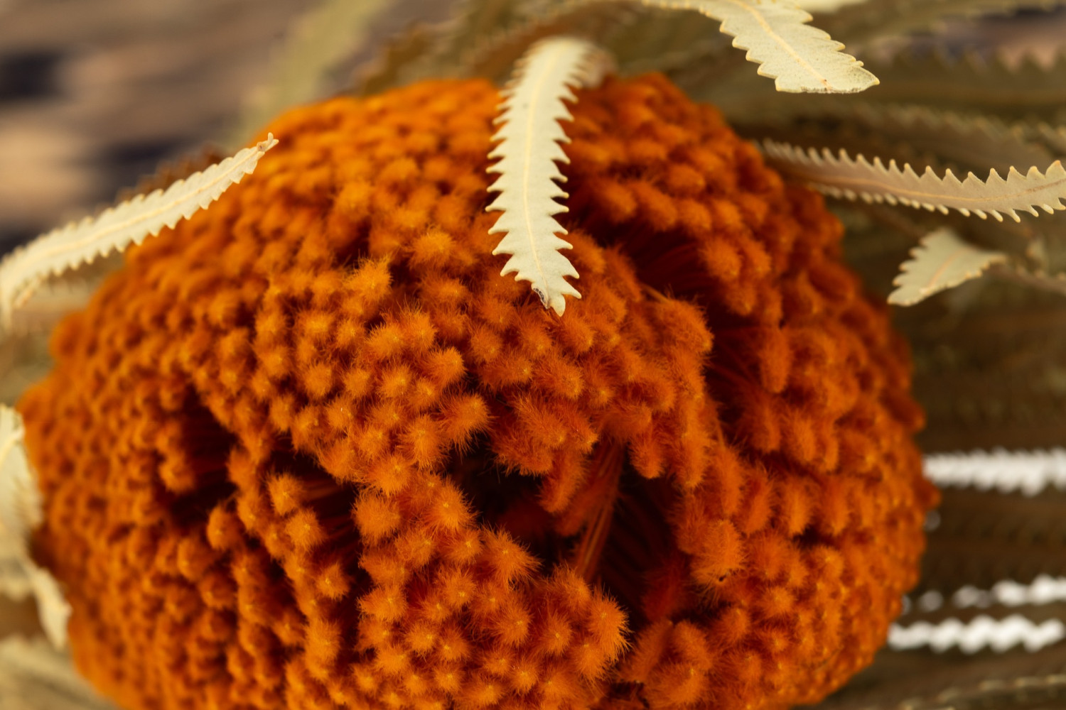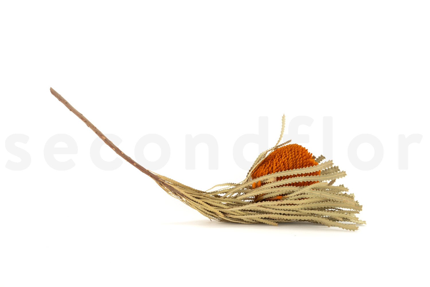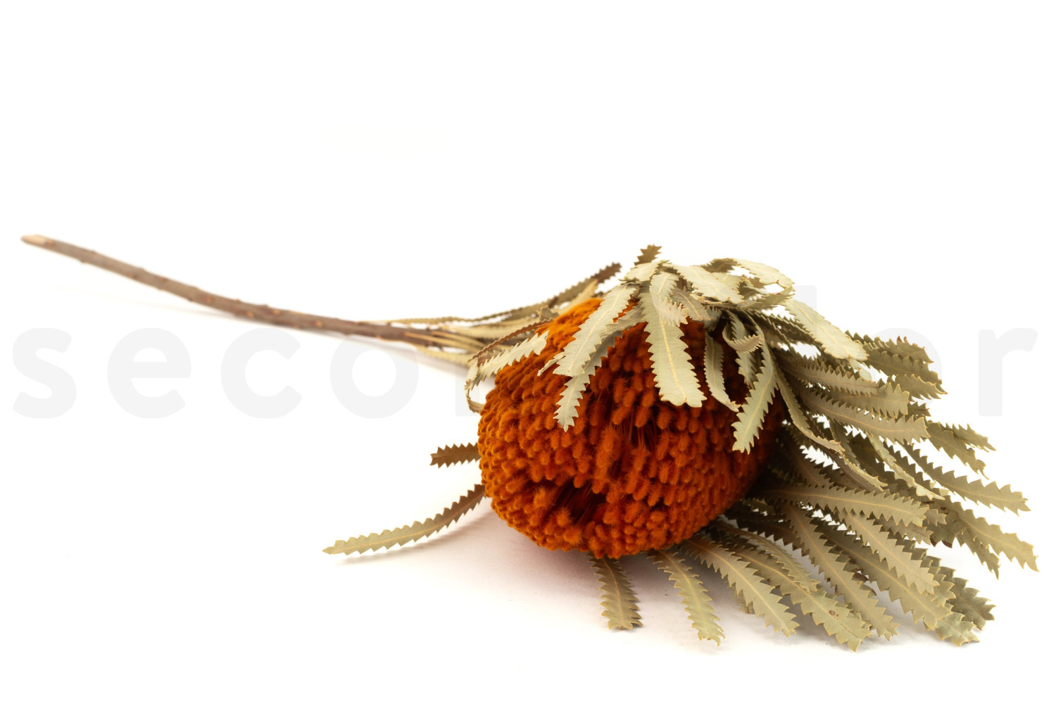 Entdecken Sie unsere Getrocknet Banksia Hookeriana - 1 Stiel - Orange, erhältlich auf SecondFlor, Ihrem Großhändler für stabilisierte Blumen und Pflanzen.