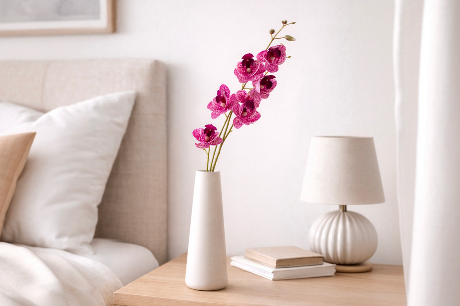 Der Maximalismus feiert in der zeitgenössischen Raumgestaltung sein Comeback. Kräftige Farben, mutige Kombinationen und bewusste Fülle stehen wieder im Mittelpunkt. Das Dunkelrosa dieser Orchidee fügt sich nahtlos in diesen Trend ein. Der intensive Farbton zieht die Blicke auf sich und setzt starke visuelle Akzente. In einem maximalistischen Interieur behauptet sich die dunkelrosa Orchidee mühelos neben auffälligen Mustern, opulenten Tapeten oder gemusterten Stoffen.