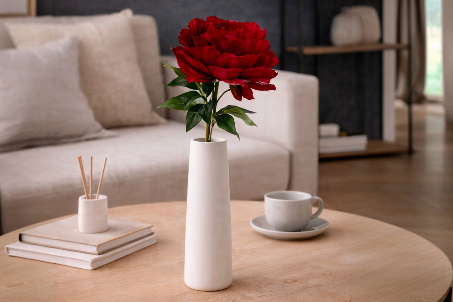 Alternativ können Sie Smaragdgrün wählen, die natürliche Komplementärfarbe von Rot. Fügen Sie dichtes Laub hinzu, um Ihre rote Pfingstrose einzurahmen und eine üppige, pflanzliche Kulisse zu schaffen. Mattes Schwarz verleiht zudem eine geheimnisvolle Note, die das Rot intensiviert – eine Kombination, die sich ideal für elegante und anspruchsvolle Dekore eignet.