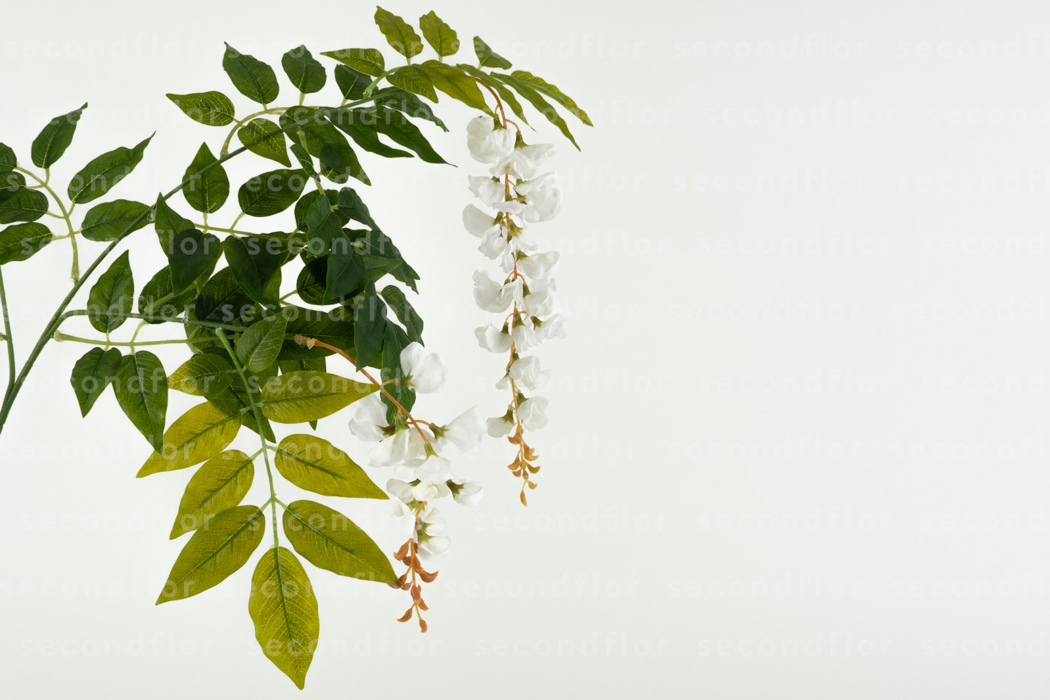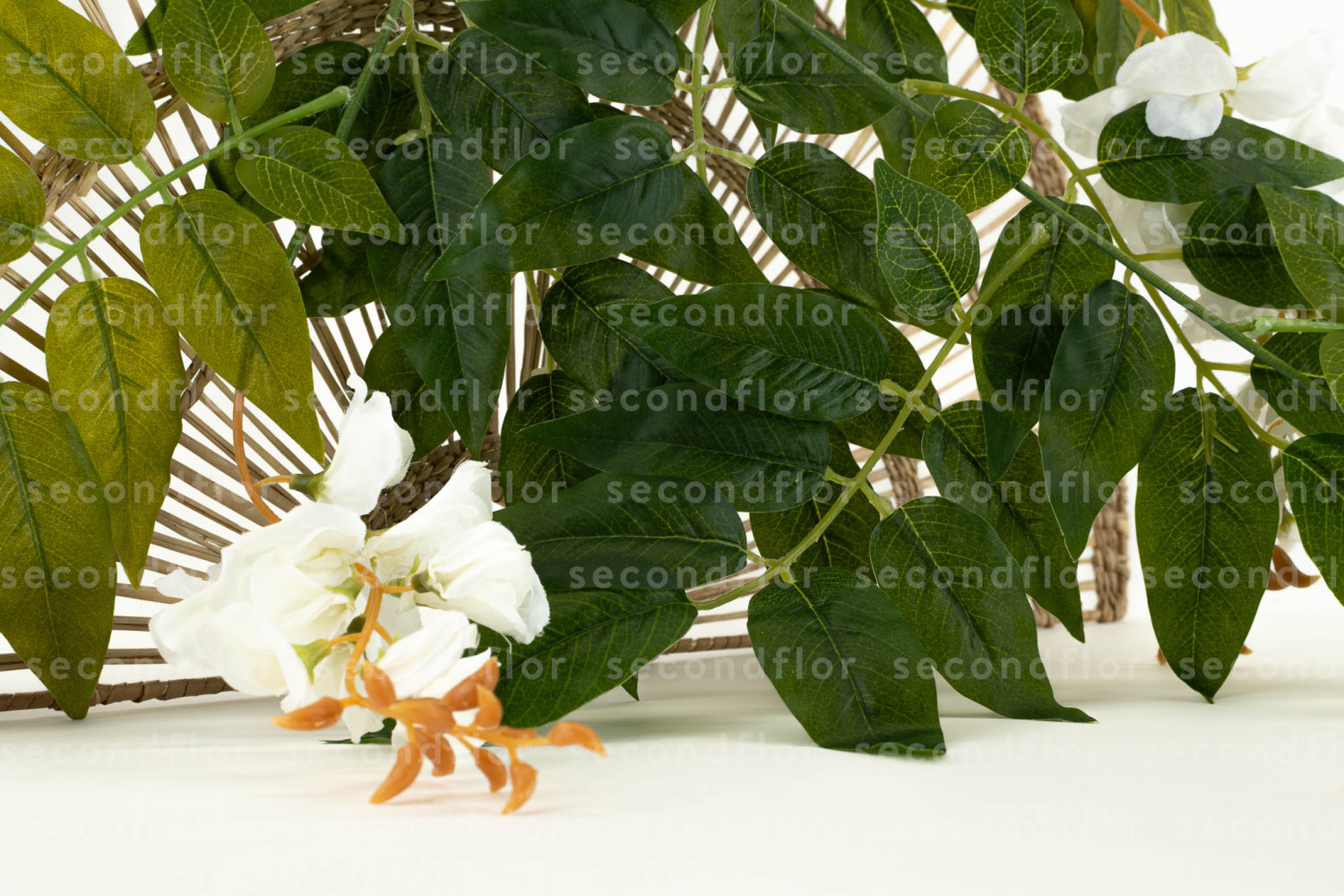 Diese künstliche Glyzinie kann verwendet werden, um ein Schaufenster zu gestalten, eine Wanddekoration zu ergänzen, einen Bogen zu bereichern oder einer Komposition einen hängenden Effekt zu verleihen. Sie besteht aus 3 weißen Blüten mit großen Blättern, wodurch sich schnell Volumen schaffen und ein Träger optisch abdecken lässt. Sie ist eine einfache Lösung, um einer Dekoration eine florale Note zu verleihen, ohne viele einzelne Elemente verwenden zu müssen.