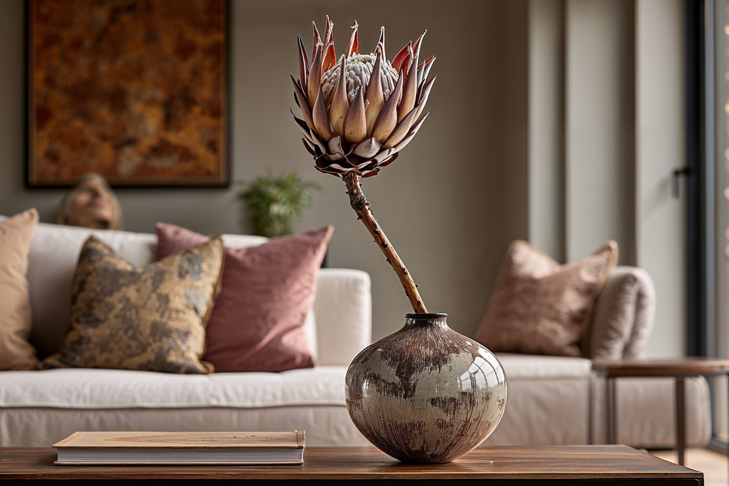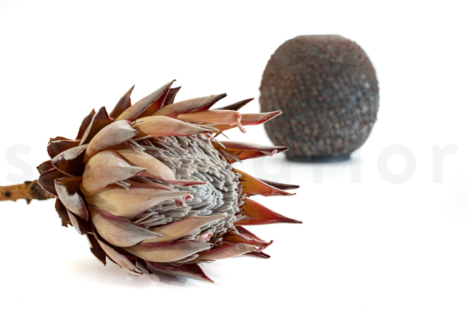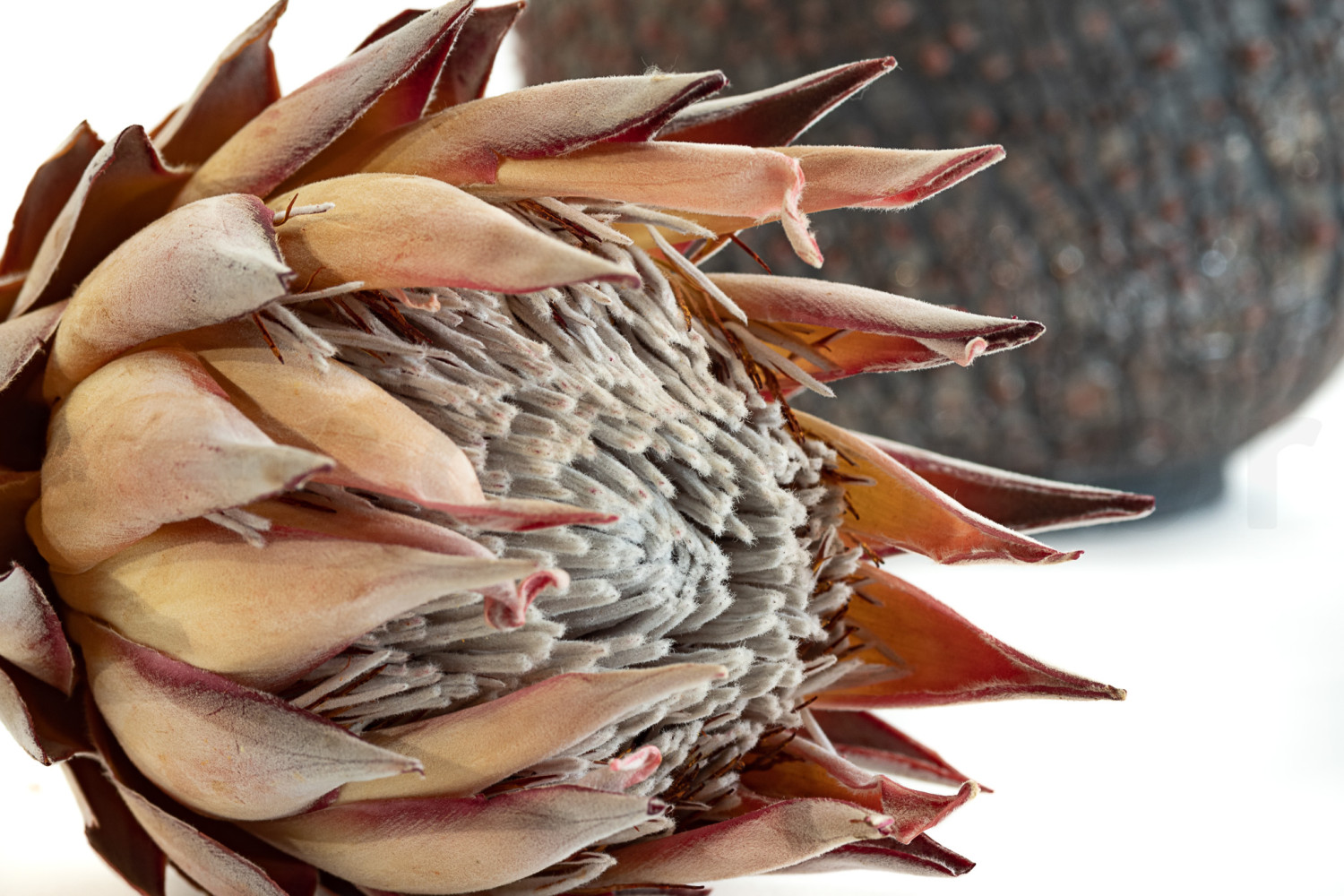 Entdecken Sie unsere Protea Cynaroides stabilisiert - 1 Stiel - Cremefarben, erhältlich auf SecondFlor, Ihrem Großhändler für stabilisierte Blumen und Pflanzen.