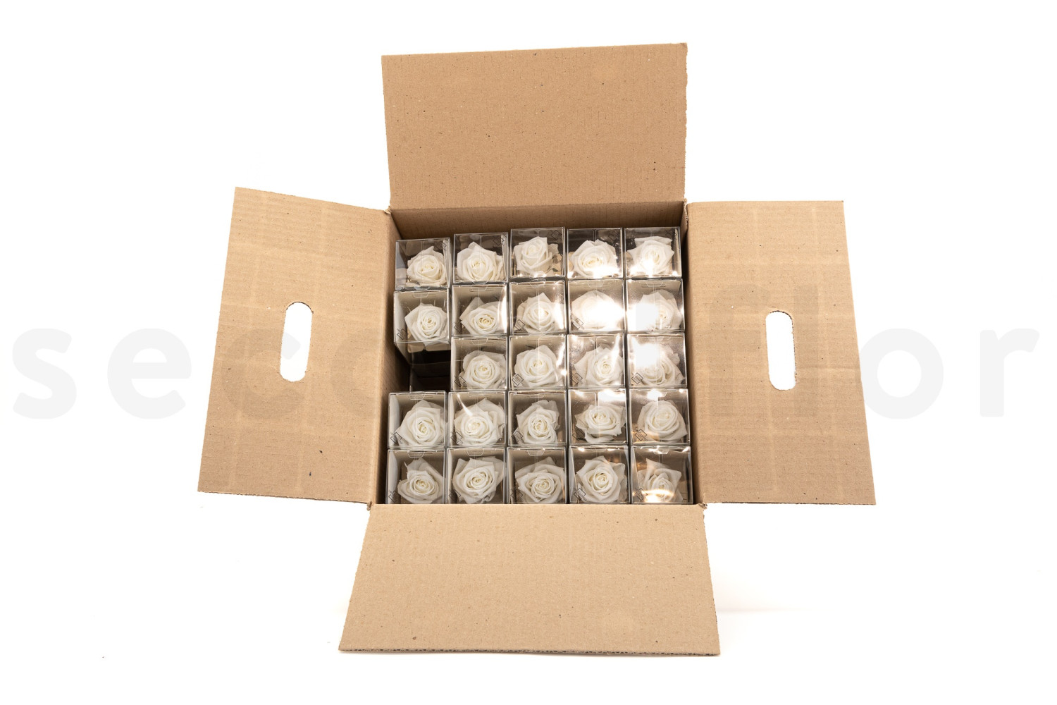 Entdecken Sie unsere Rosen mit Stängel stabilisiert 30 cm - Gift Box 25 Stück - Weiß, erhältlich auf SecondFlor, Ihrem Großhändler für stabilisierte Blumen und Pflanzen.