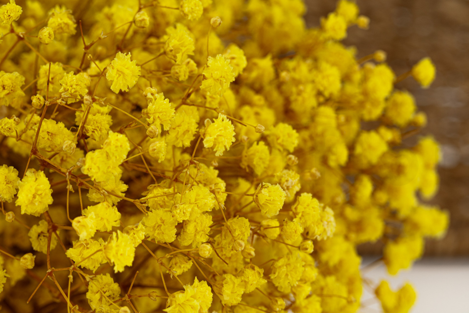 Gelb ist eine lebendige und anregende Farbe, ideal, um Tiefe und Kontraste in verschiedene Blumenarrangements zu bringen. Ob im Sommer für frische und fröhliche Kompositionen oder im Winter, um einen Hauch von Licht zu verleihen, das Gelbe Schleierkraut ist äußerst vielseitig.