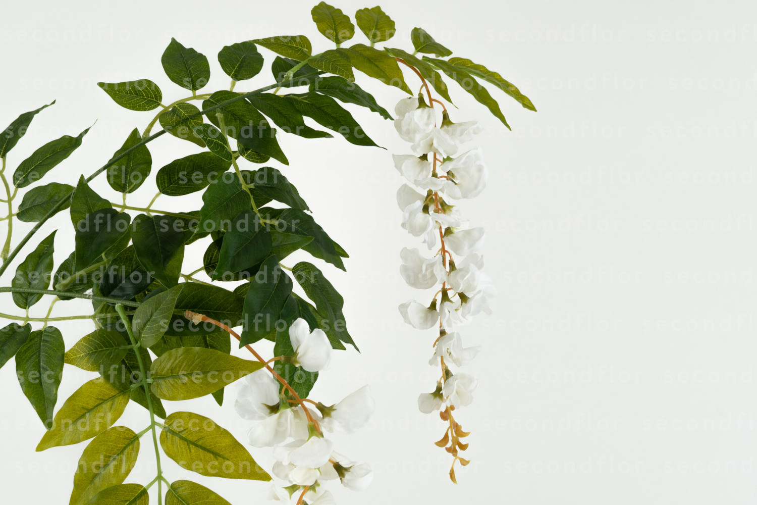 This artificial wisteria can be used to dress a window display, complete a wall decoration, enhance an arch or add a trailing effect to an arrangement. It is made up of 3 white flowers accompanied by broad leaves, making it easy to add volume quickly and visually cover a support. It is a simple solution for adding a floral touch to a display without needing to multiply the number of elements.