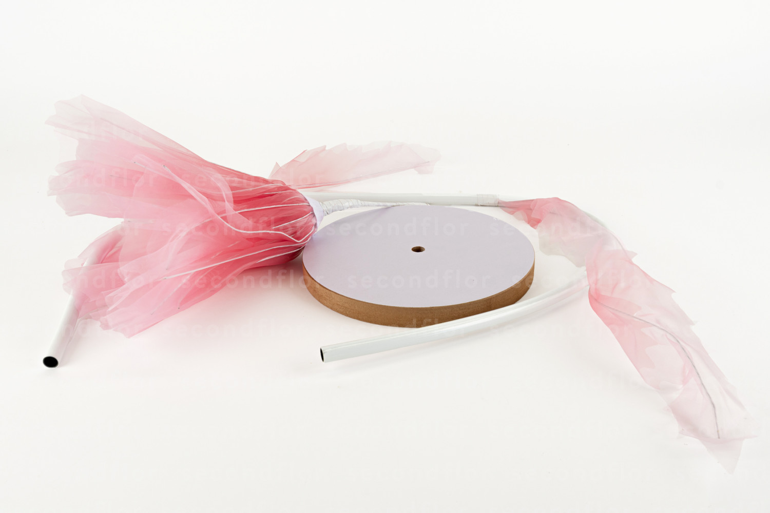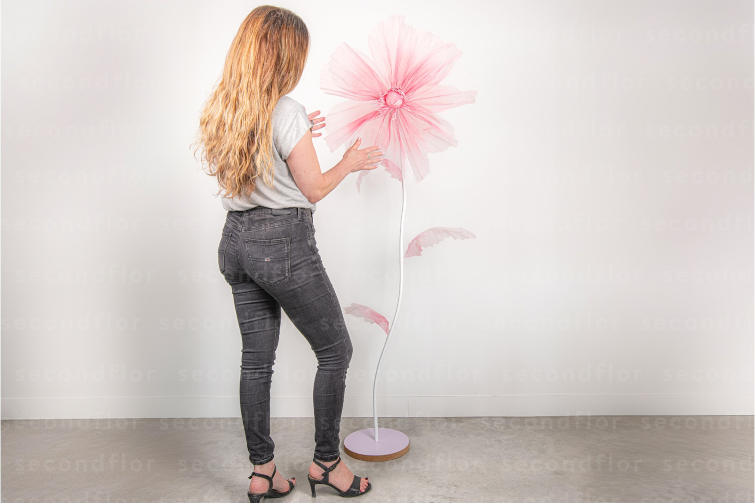The giant artificial poppy can be used to create decorative settings for scenography, events or weddings. Its organza petals and leaves include an inner metal stem, making it easy to shape them to achieve the desired effect. Its PVC stem, which is also flexible, helps adjust the overall silhouette of the flower to suit the installation. A wooden base allows the poppy to stand upright for easy placement on the floor or on a flat surface. It is a practical solution for creating a voluminous, airy and whimsical display.
