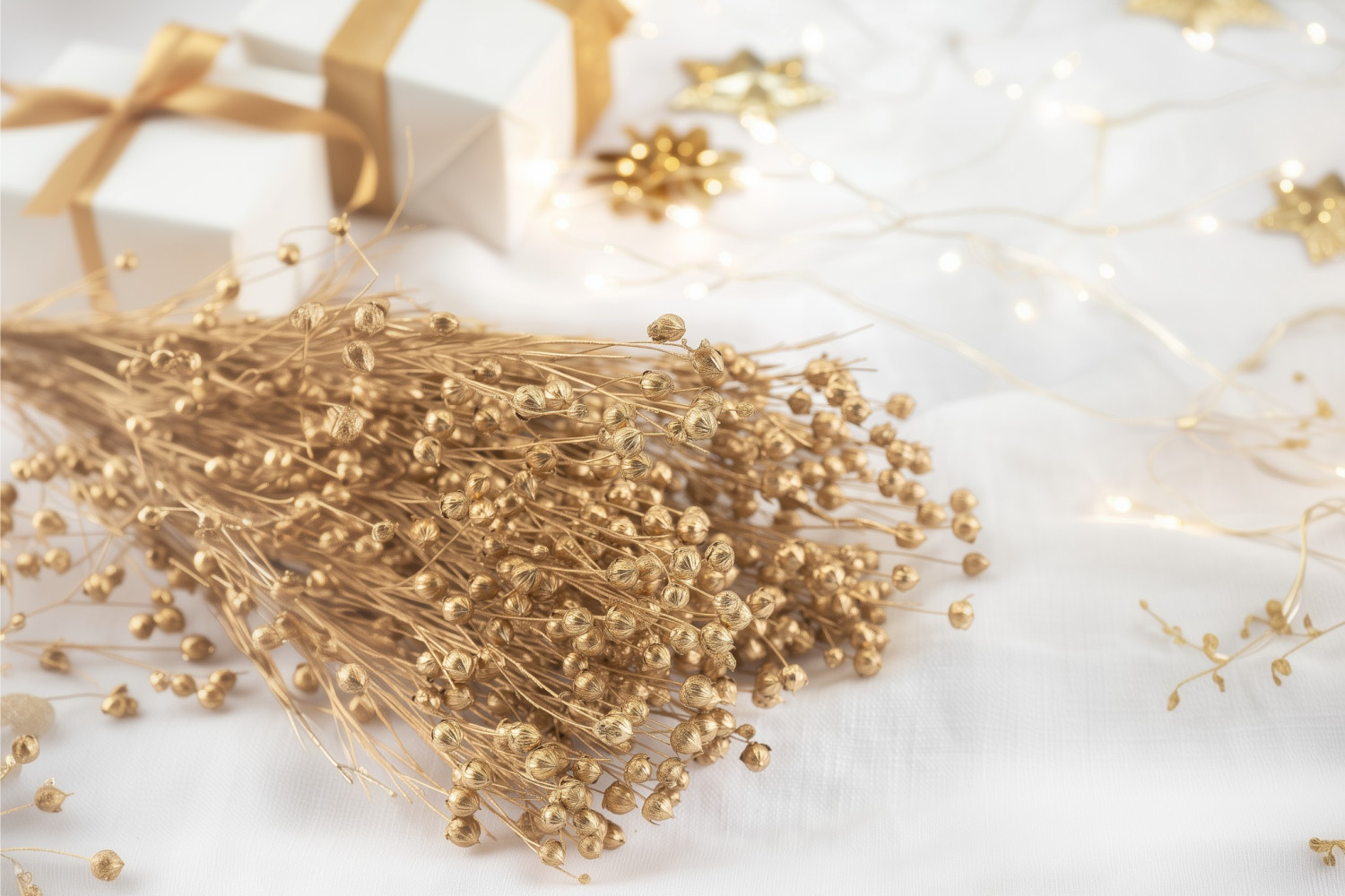 Additionally, golden flax is particularly well-suited to festive floral displays, such as table centrepieces or garlands, where its glow helps brighten the space. By mixing it with plants of varying heights and textures, such as preserved gypsophila or lavender sprigs, flax can also be incorporated into more complex arrangements, while maintaining overall harmony. Golden flax is a versatile choice, adding volume, shape, and sparkle to your floral creations.