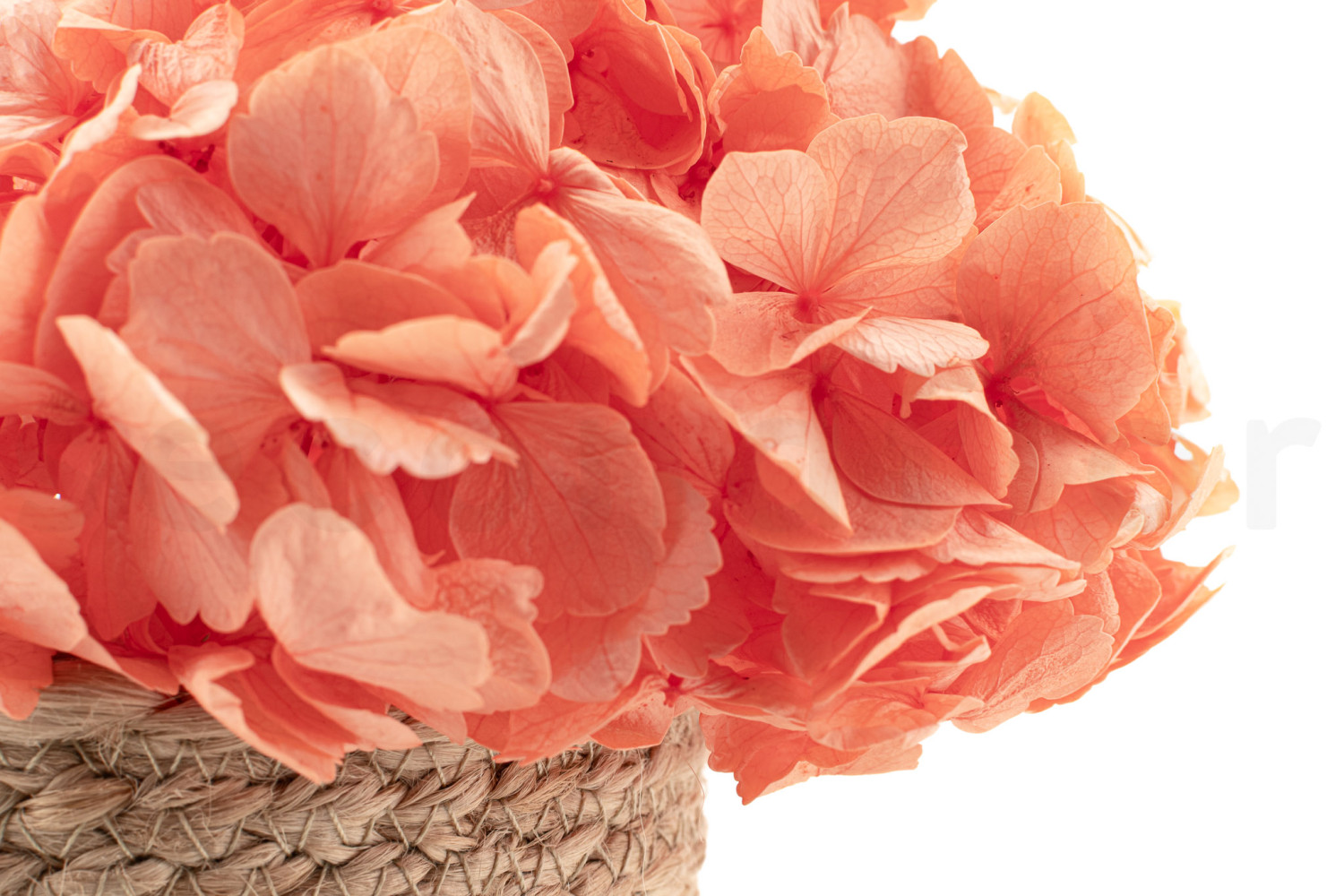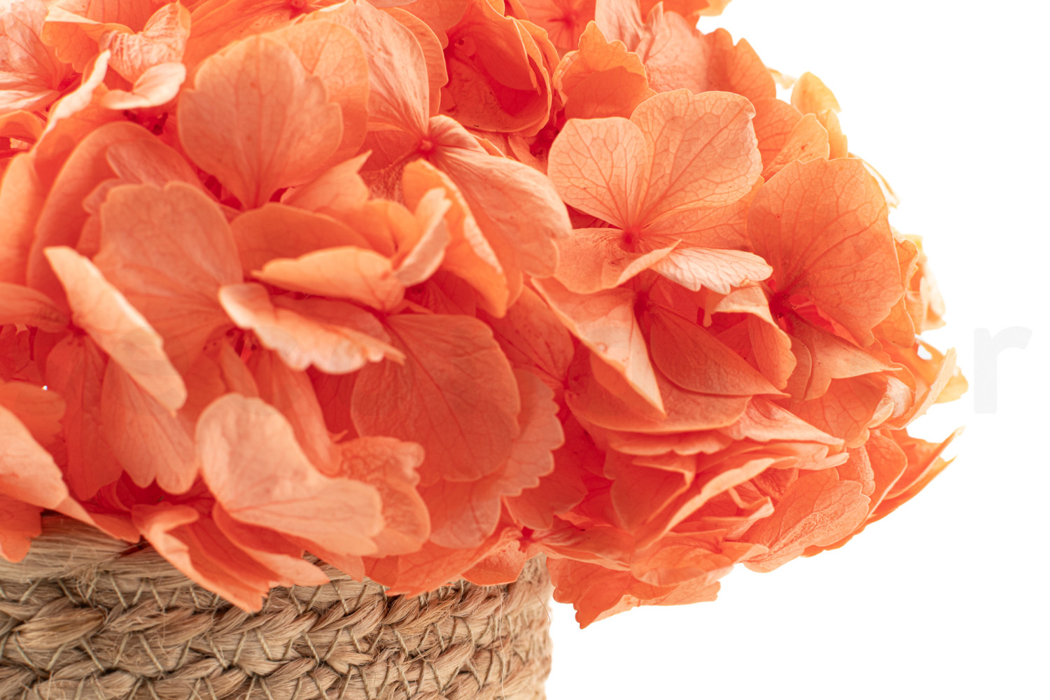 Preserved Coral Orange Hydrangea is a valuable ally for many floral creations. In a preserved plant wall or a floral artwork, it provides unmatched depth and intensity, immediately drawing attention. Its generous volume also makes it an ideal choice for airy compositions, such as wedding arches or floral suspensions.
