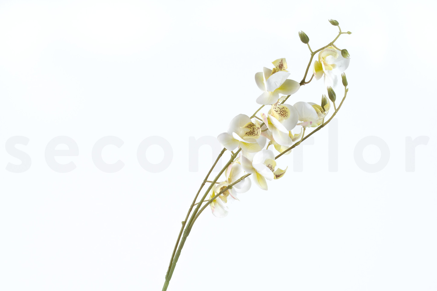 Cada tallo de orquídea presenta varias flores cuyos pétalos muestran ligeras matizaciones. A pesar de su apariencia delicada, la estructura es firme y garantiza una excelente sujeción en todo tipo de montajes. El color crema funciona perfectamente tanto en interiores contemporáneos como en espacios más clásicos.