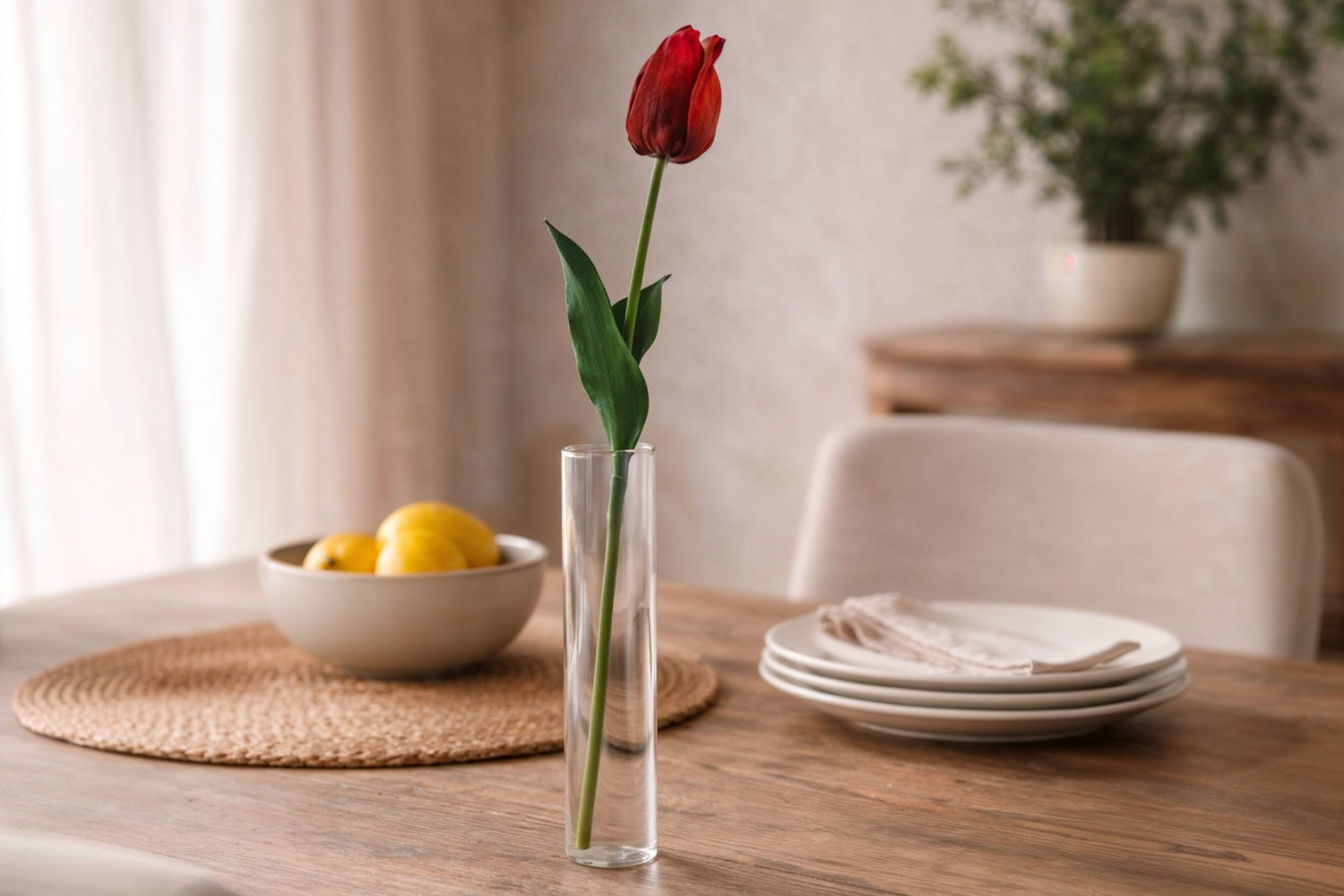 Nuestra tulipa artificial burdeos reproduce fielmente la textura aterciopelada de los pétalos naturales. Los matices están trabajados con precisión para reflejar toda su profundidad característica. El tallo rígido garantiza una sujeción perfecta en jarrones y composiciones. Sin mantenimiento, sin marchitarse: tu decoración se mantiene impecable temporada tras temporada.