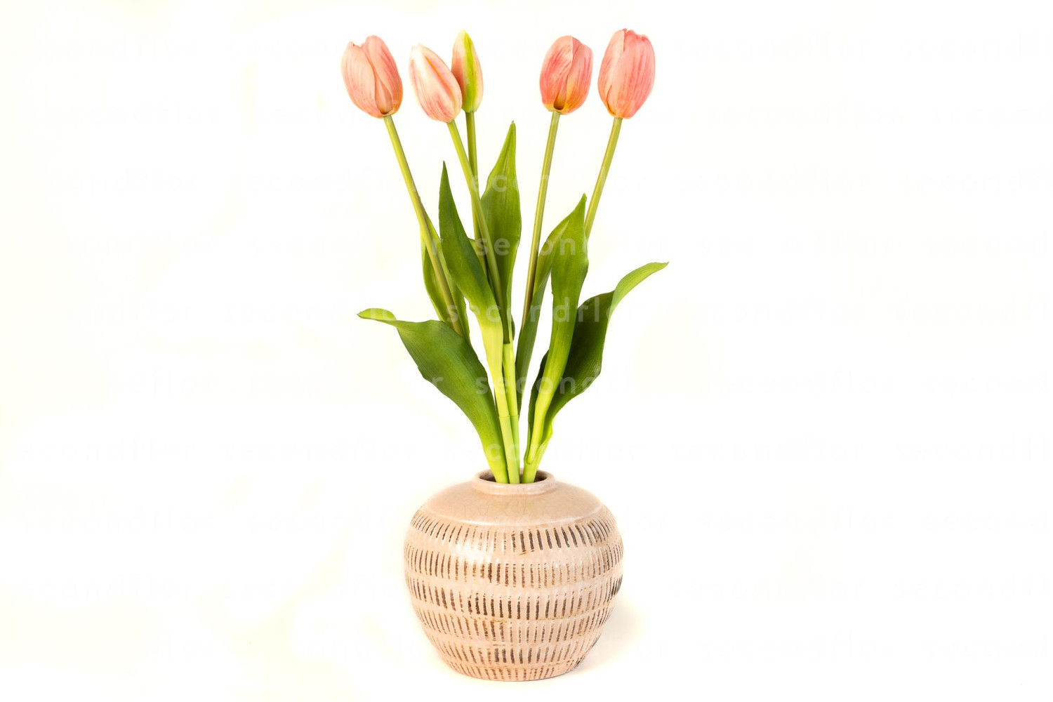 Este ramo de tulipanes artificiales es ideal para crear rápidamente una pequeña decoración floral en un jarrón, sobre una mesa, un mostrador o en un escaparate. Está disponible en varios colores para adaptarse a diferentes estilos y ambientes. El ramo se compone de 5 flores, entre ellas 3 tulipanes abiertos y 2 capullos, así como de 8 hojas largas, para un resultado equilibrado y ya bien estructurado.