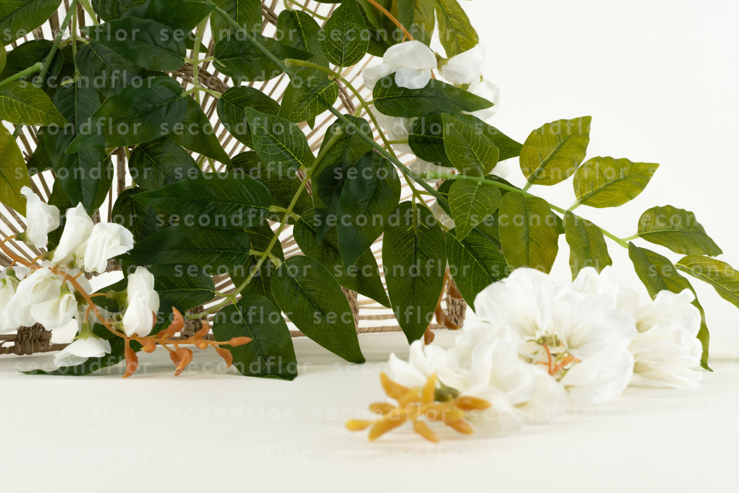 Esta glicinia artificial puede utilizarse para vestir un escaparate, completar una decoración mural, enriquecer un arco o añadir un efecto colgante en una composición. Se compone de 3 flores blancas acompañadas de hojas anchas, lo que permite aportar rápidamente volumen y cubrir visualmente un soporte. Es una solución sencilla para añadir un toque floral a una decoración sin tener que multiplicar los elementos.