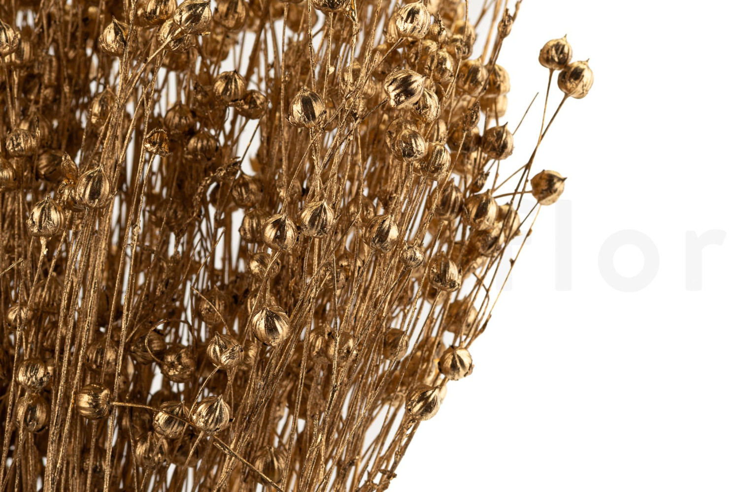 El lino dorado se asocia maravillosamente con una amplia gama de plantas y colores. Su tono metálico le permite integrarse fácilmente en composiciones tanto clásicas como modernas. Por ejemplo, puede utilizarse junto a eucalipto o helechos para una decoración natural y minimalista. Sus pequeñas bolas doradas también contrastan elegantemente con flores más opulentas, como peonías o rosas, aportando un toque brillante sin recargar la composición.