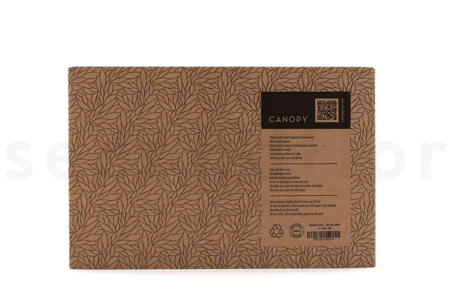 Embalaje : Una caja de cartón de 29 x 19 x 6,5 cm. Una caja kraft con diseño de follaje, compacta y práctica, con tapa tipo vitrina. Ideal para creaciones en pequeño formato o para revender directamente en tienda.