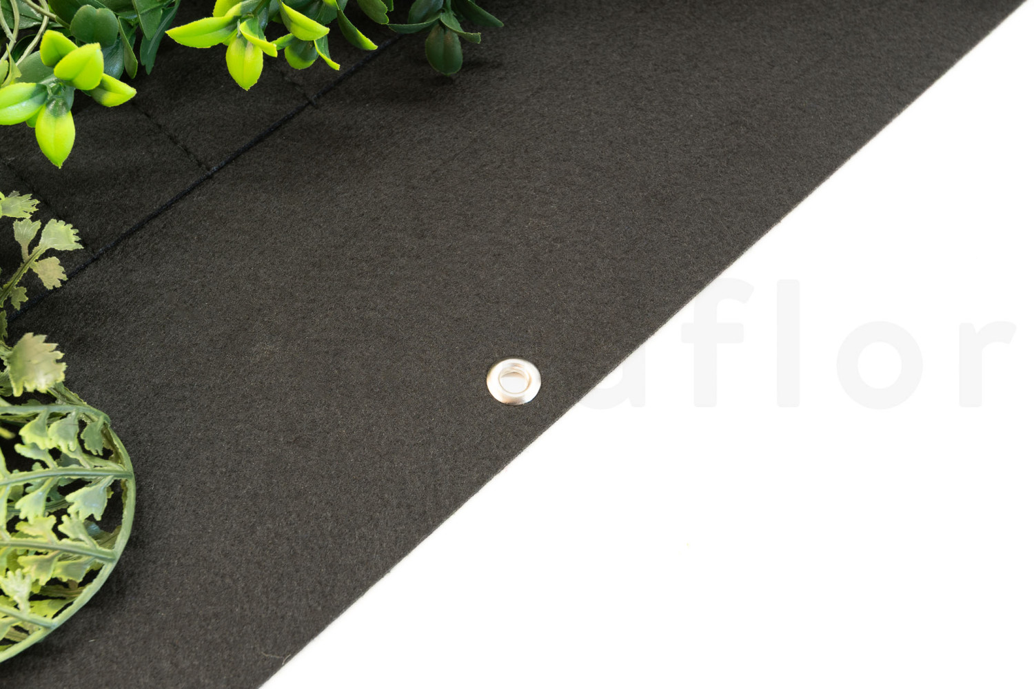 Este soporte de fieltro negro para muro vegetal está diseñado para crear fácilmente decoraciones vegetales a medida. Sus bandas de fieltro forman compartimentos que permiten insertar los vegetales uno junto a otro, ya sean preservados, secos o artificiales. Los ojales metálicos distribuidos por todo el soporte garantizan la fijación mural y también permiten unir varios soportes entre sí para cubrir una superficie mayor. Ligero y fácil de transportar, constituye una solución práctica para realizar muros vegetales, revestimientos murales e instalaciones decorativas vegetales.