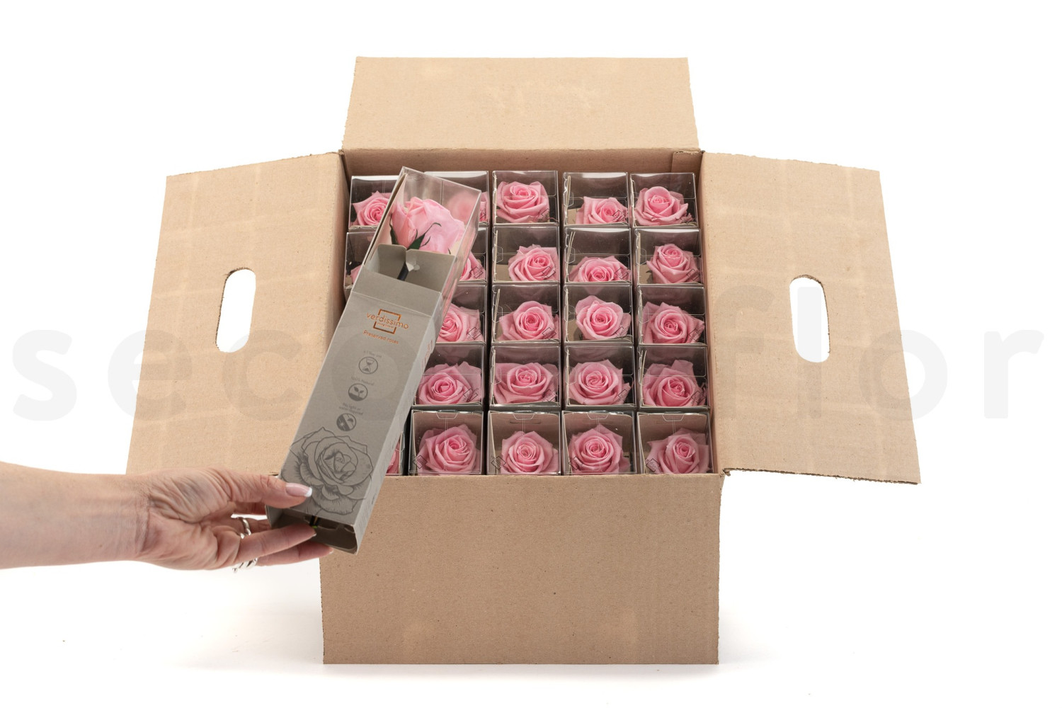 Descubra nuestros Rosas preservadas con tallo 30 cm - Gift Box 25 unidades - Pastel Pink, disponibles en SecondFlor, su mayorista de flores y plantas preservadas.