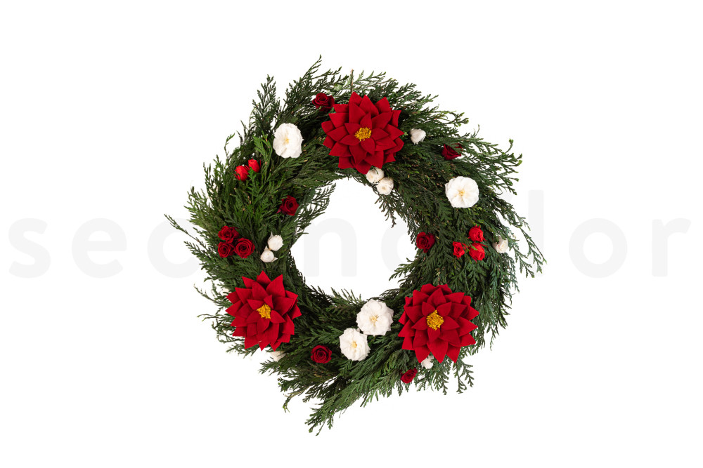 - Couronnes murales : Utilisez le poinsettia comme pièce maîtresse, entouré de feuillages verts.