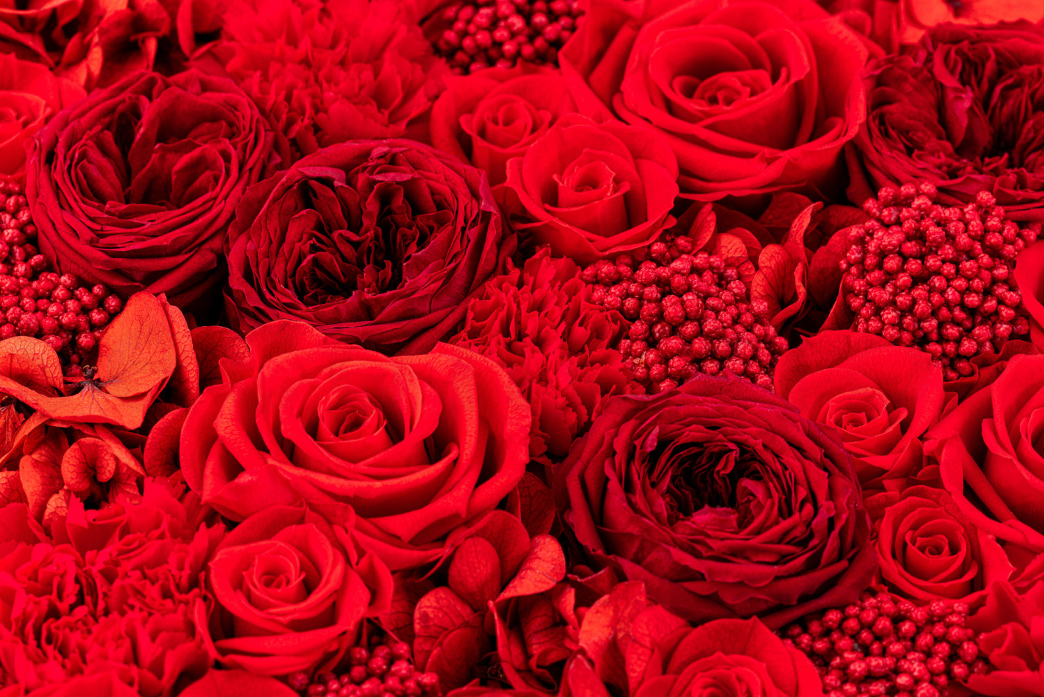 • Variété(s) : Roses rouges, oeillets rouges, hortensia rouge.