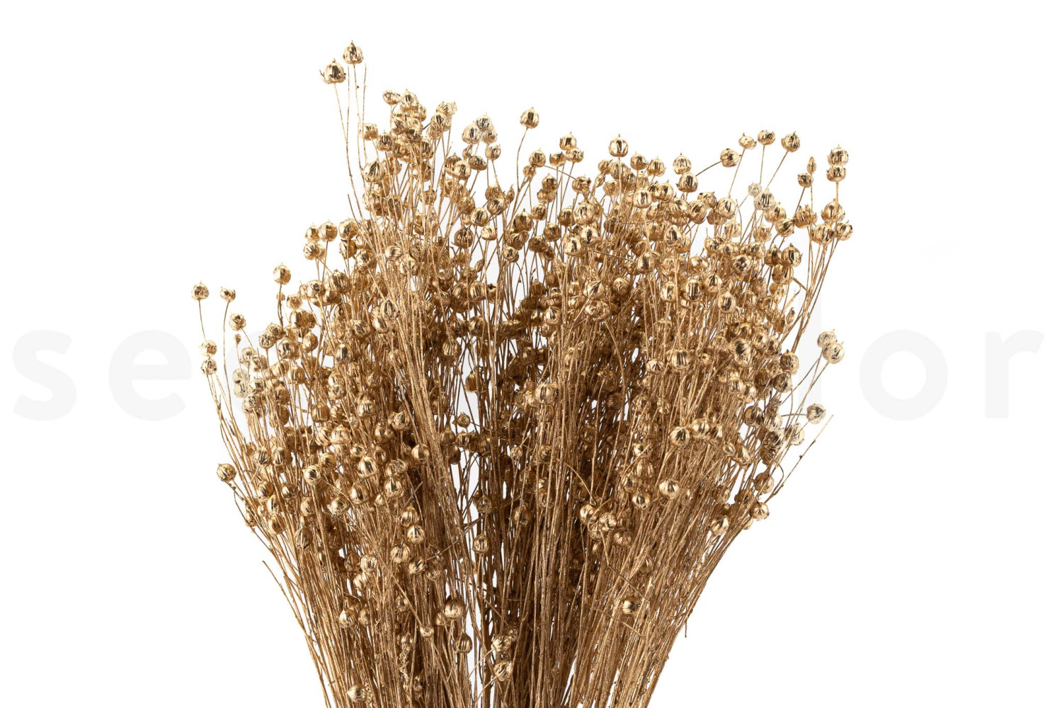 Le lin doré s'associe merveilleusement avec une large gamme de végétaux et de couleurs. Sa teinte métallique lui permet de s’intégrer facilement dans des compositions classiques ou modernes. Par exemple, il peut être utilisé en complément d’eucalyptus ou de fougères pour une décoration naturelle et minimaliste. Ses petites boules dorées peuvent aussi contraster élégamment avec des fleurs plus opulentes, comme les pivoines ou les roses, apportant une touche scintillante sans surcharger la composition.