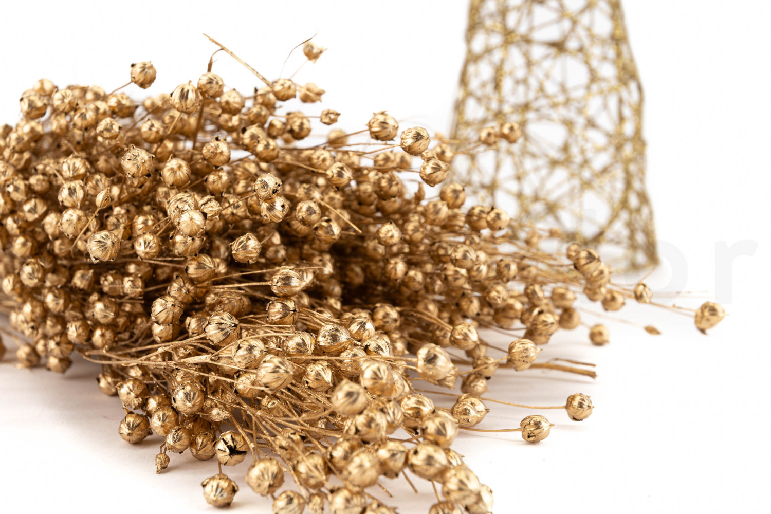 De plus, le lin doré se prête particulièrement bien aux compositions florales de type centre de table ou guirlandes pour les fêtes, où son éclat contribue à illuminer l’espace. En jouant avec des végétaux de différentes hauteurs et textures, comme le gypsophile stabilisé ou les brins de lavande, le lin peut également être intégré dans des arrangements plus complexes, tout en gardant une harmonie générale. Le lin doré est un choix polyvalent, apportant volume, forme et éclat à vos créations florales.