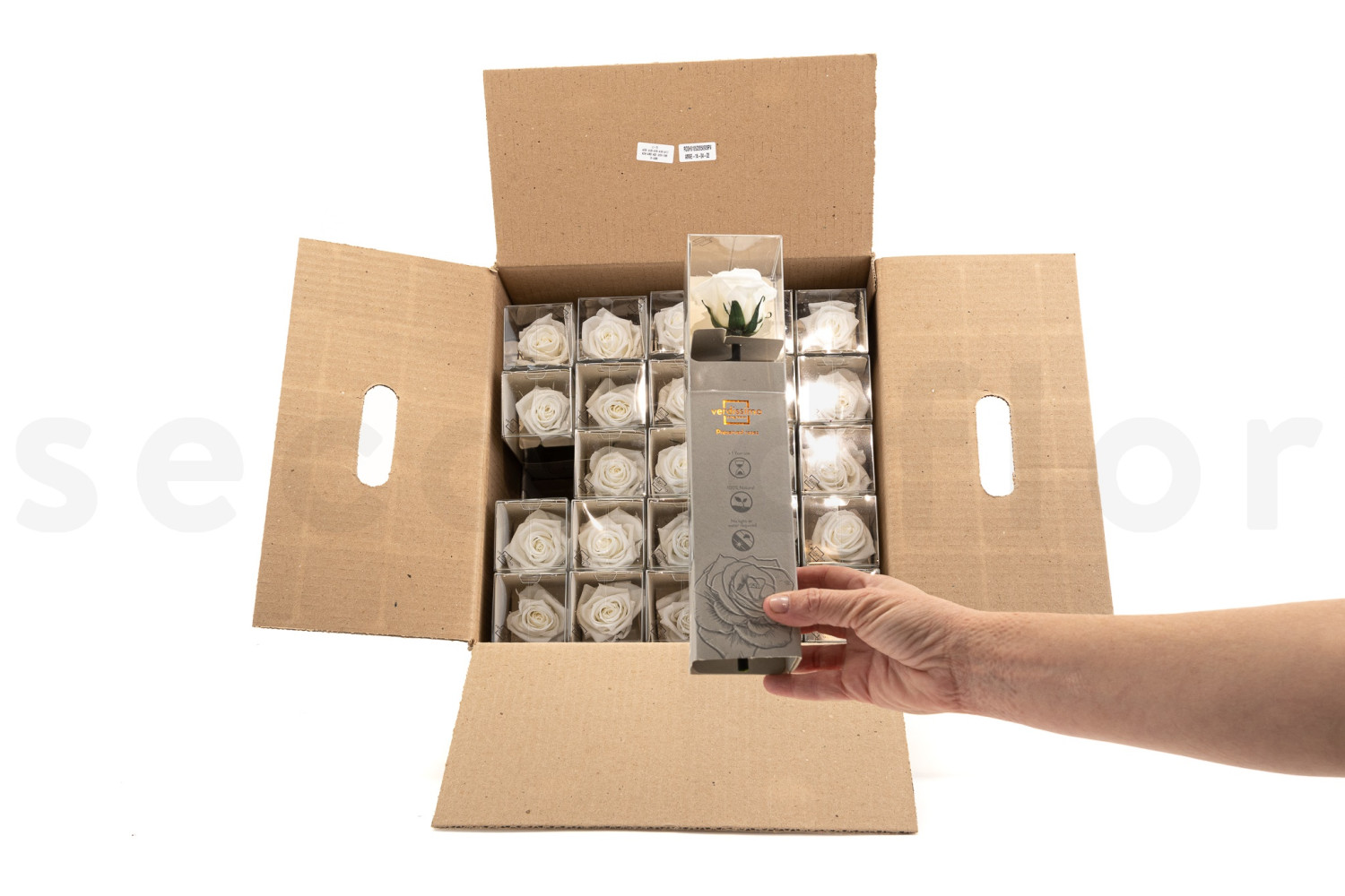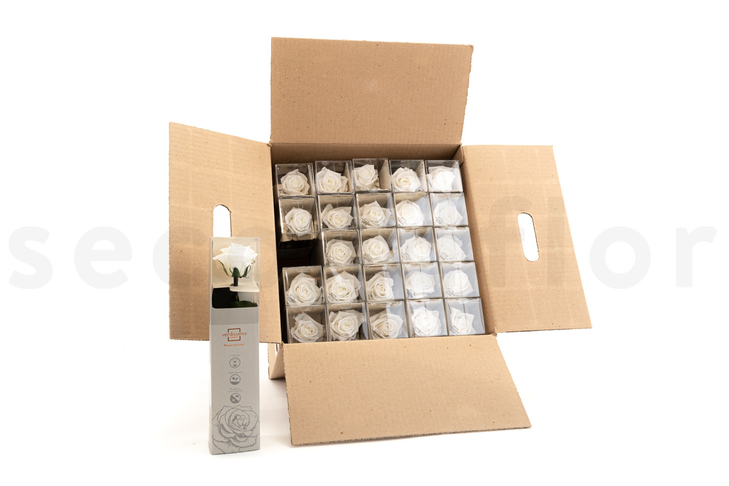 Découvrez nos Roses sur tige stabilisées 30cm - Gift Box 25 unités - Blanc, disponibles sur SecondFlor, votre grossiste en fleurs et plantes stabilisées.