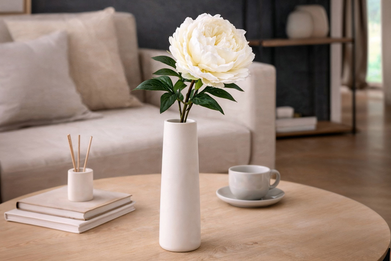 Materiali naturali come legno grezzo, lino o rattan si sposano perfettamente con la peonia crema. Vetro soffiato e ceramica artigianale diventano cornici ideali per valorizzarla.