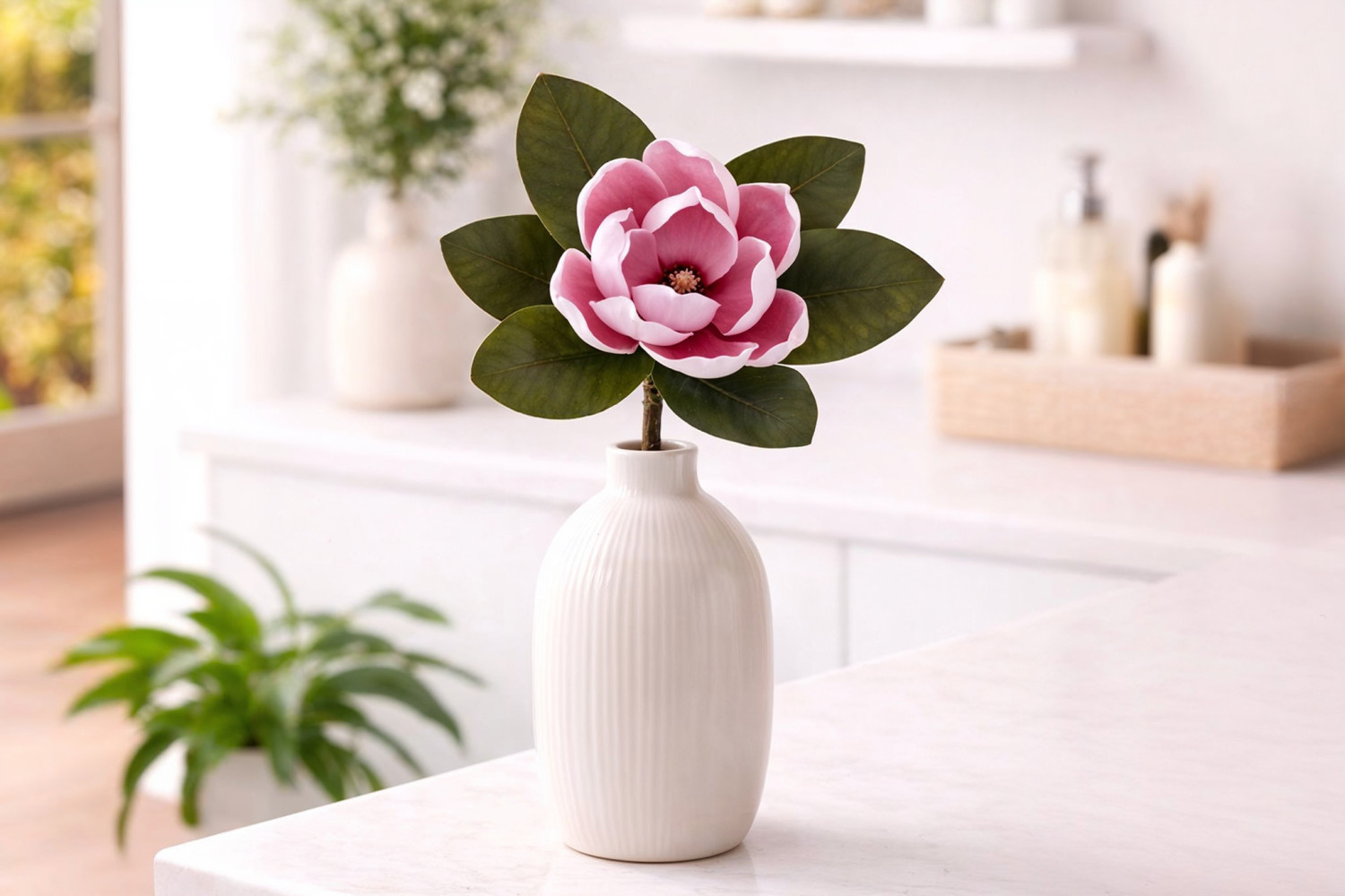 La magnolia rosa evoca la dolcezza primaverile e dona immediatamente una sensazione di tenerezza agli spazi professionali. Ammorbidisce le linee e crea un’atmosfera accogliente. La nostra magnolia artificiale rosa riproduce fedelmente le sfumature delicate del fiore fresco. È inoltre possibile regolare facilmente l’apertura dei petali in base alle vostre esigenze creative.