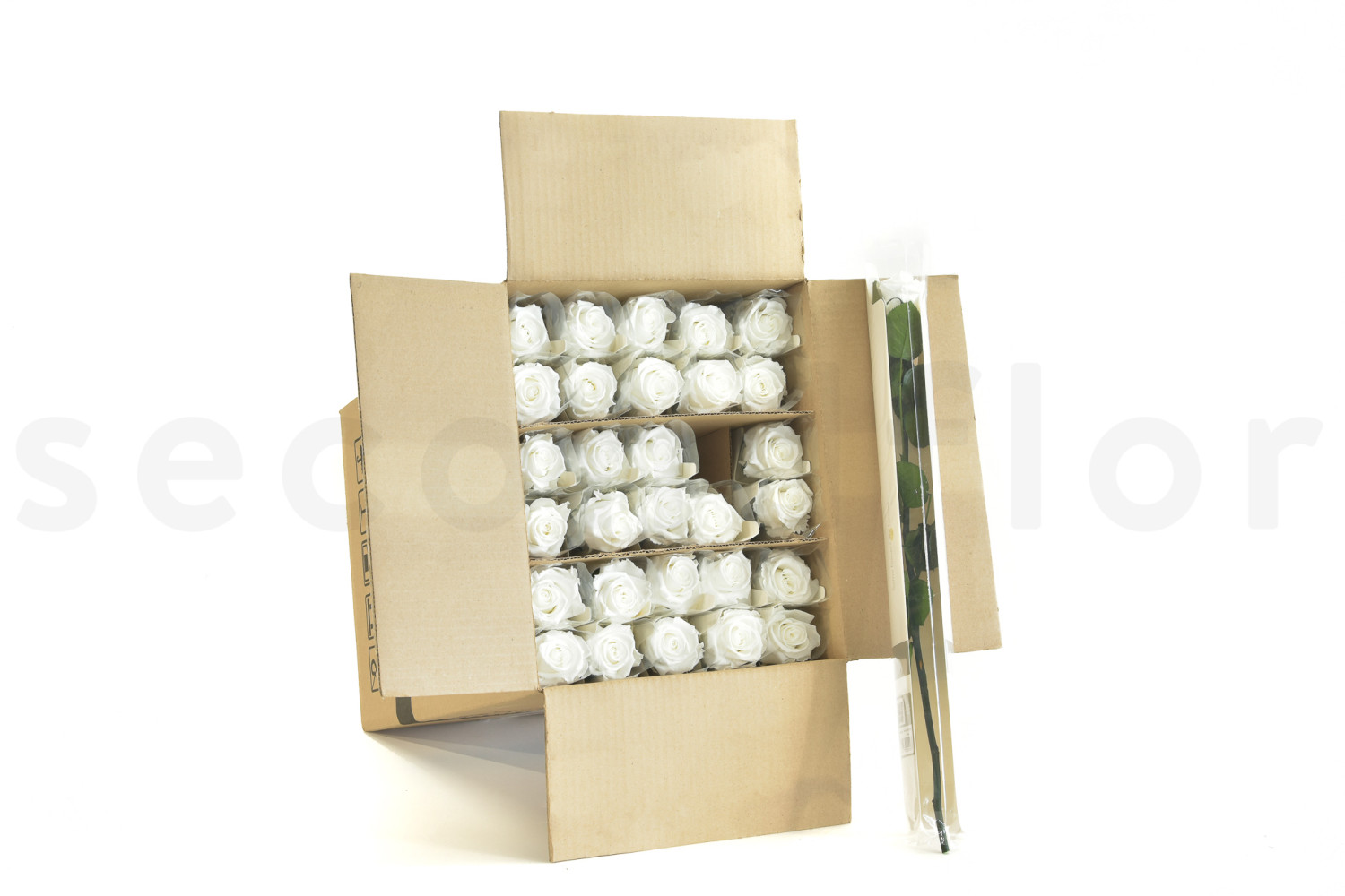 Trovate la rosa su stelo e la sua busta di protezione individuale in una scatola da 30 unità.