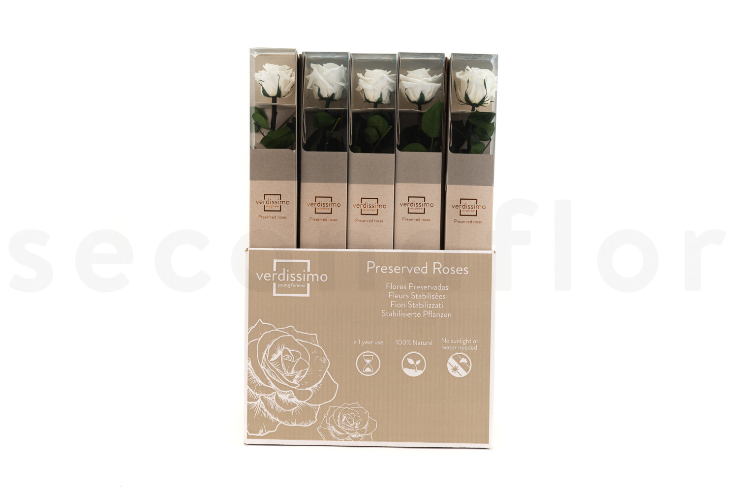 Ogni rosa è presentata in una rigida confezione Gift Box, che la rende un regalo elegante e pronto da regalare. Questa confezione protegge il fiore e garantisce che sia presentato con cura. Questa confezione rende le rose perfette per regali aziendali o eventi.